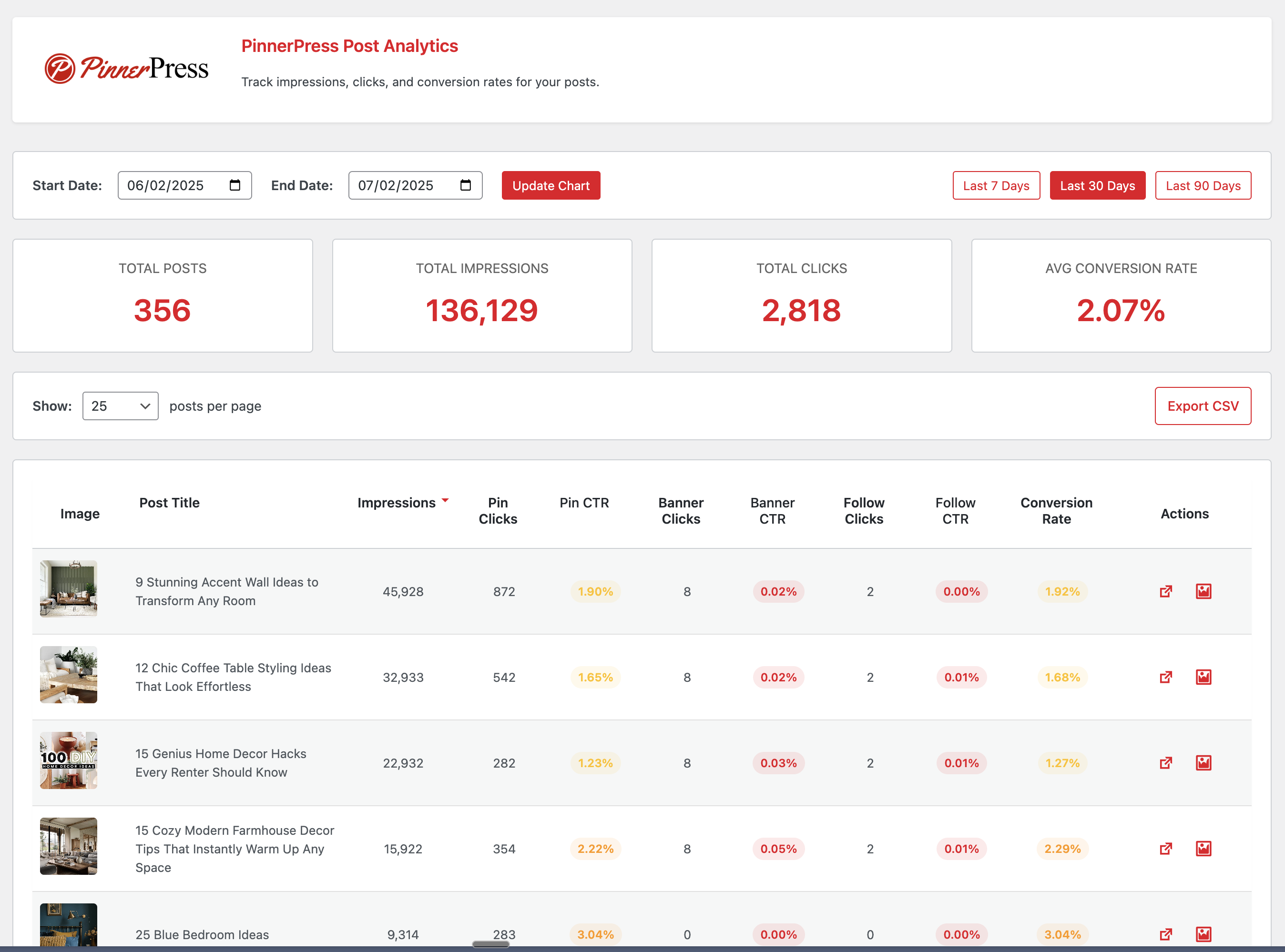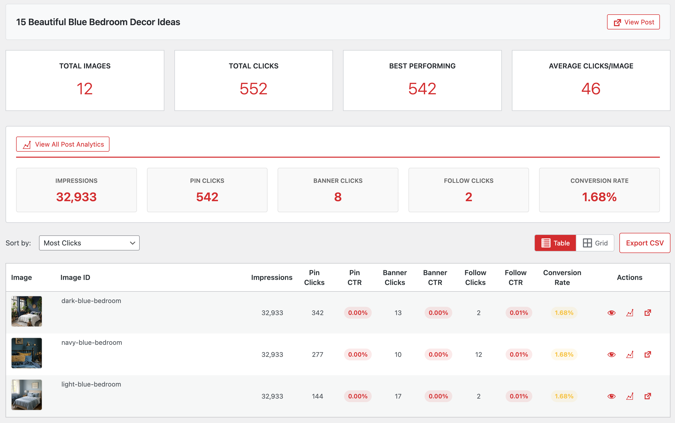 For example, add or swap out better images for your posts with the lowest performing pin it button click rate (Pin CTR).